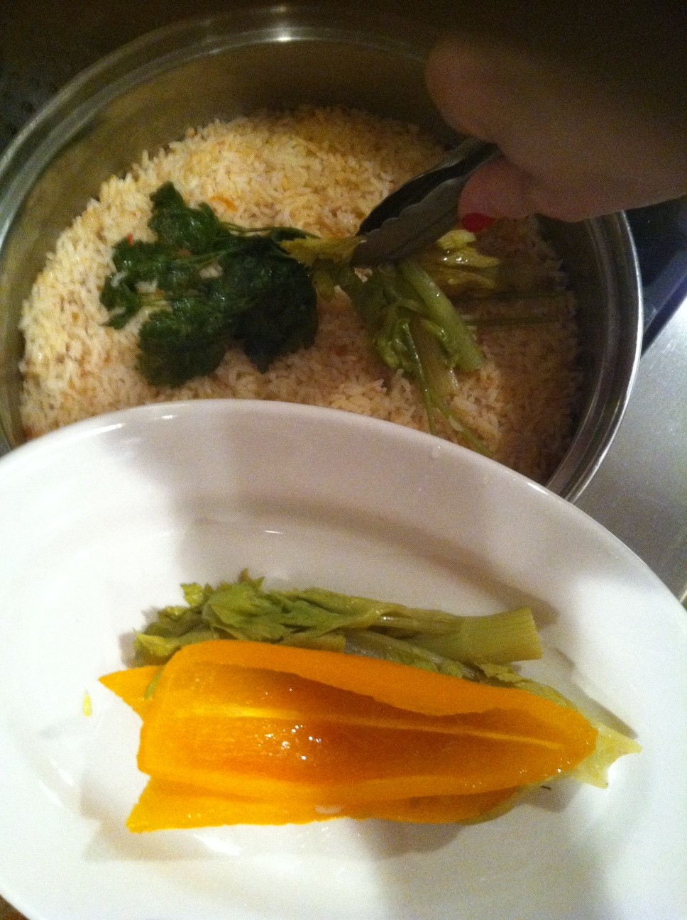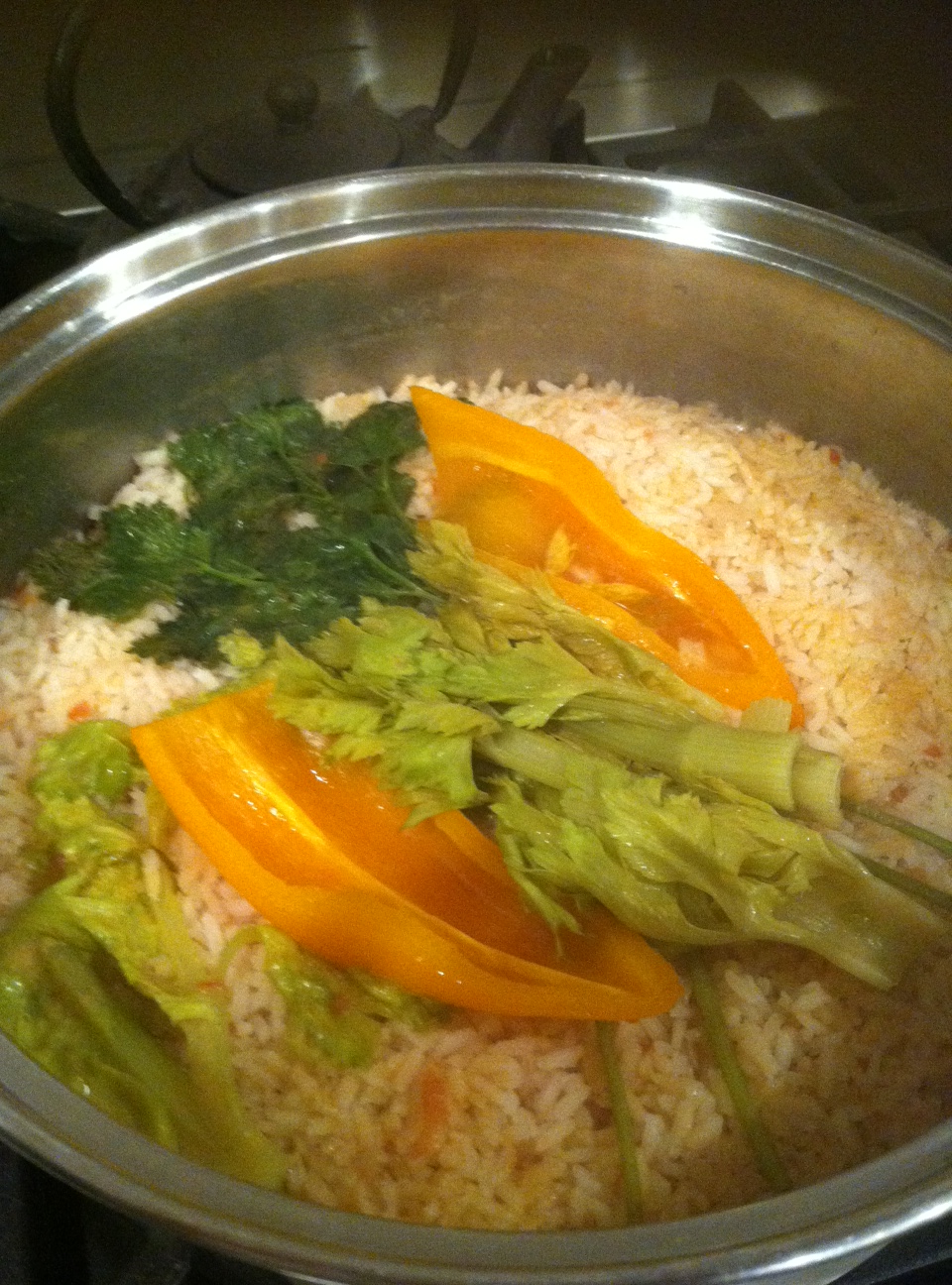 Bring water and tomato juice to boil and add rice, olive oil and salt while stirring.  Lower heat to low and drop in celery, parsley, and pepper halves.  Do not stir, cover with lid and DO NOT TOUCH for 21 minutes.  rice stuff