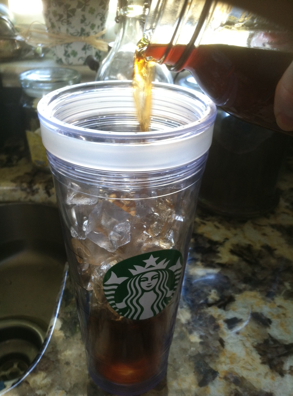 Grab a quart size *canning jar with lid (recycled sauce jar also works) and drop in 5 sugar cubes. You will have to adjust to your taste. I prefer natural sugar from pure cane’; Artificial sweeteners tend to be sweeter. Now add 4 cups of hot coffee and let stand for approximately 15 minutes. Make sure sugar has dissolved and close with lid and chill for at least an hour. I always brew my coffee the night before.