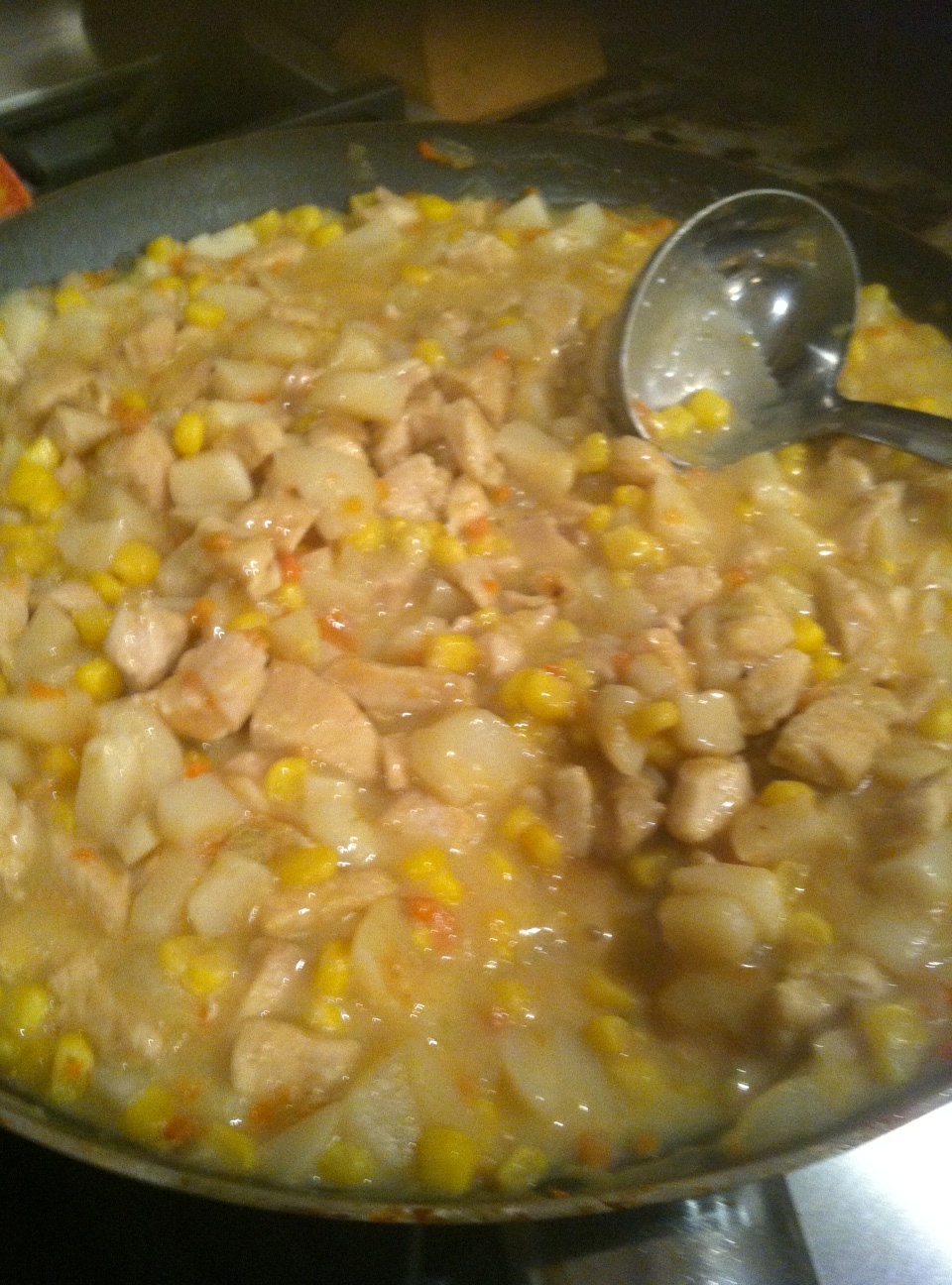 Sauté chicken and onions in oil in a large frying pan over low heat, stirring occasionally. Cook until chicken has lost its pink tone; do not brown or discolor. Continue to cook until onion becomes transparent. Add chicken broth and bring to boil, add potato and carrots; continue to simmer until potato has lost its crunch approx. 10 minutes. Add soup and corn, mix well; simmer 5 more minutes.