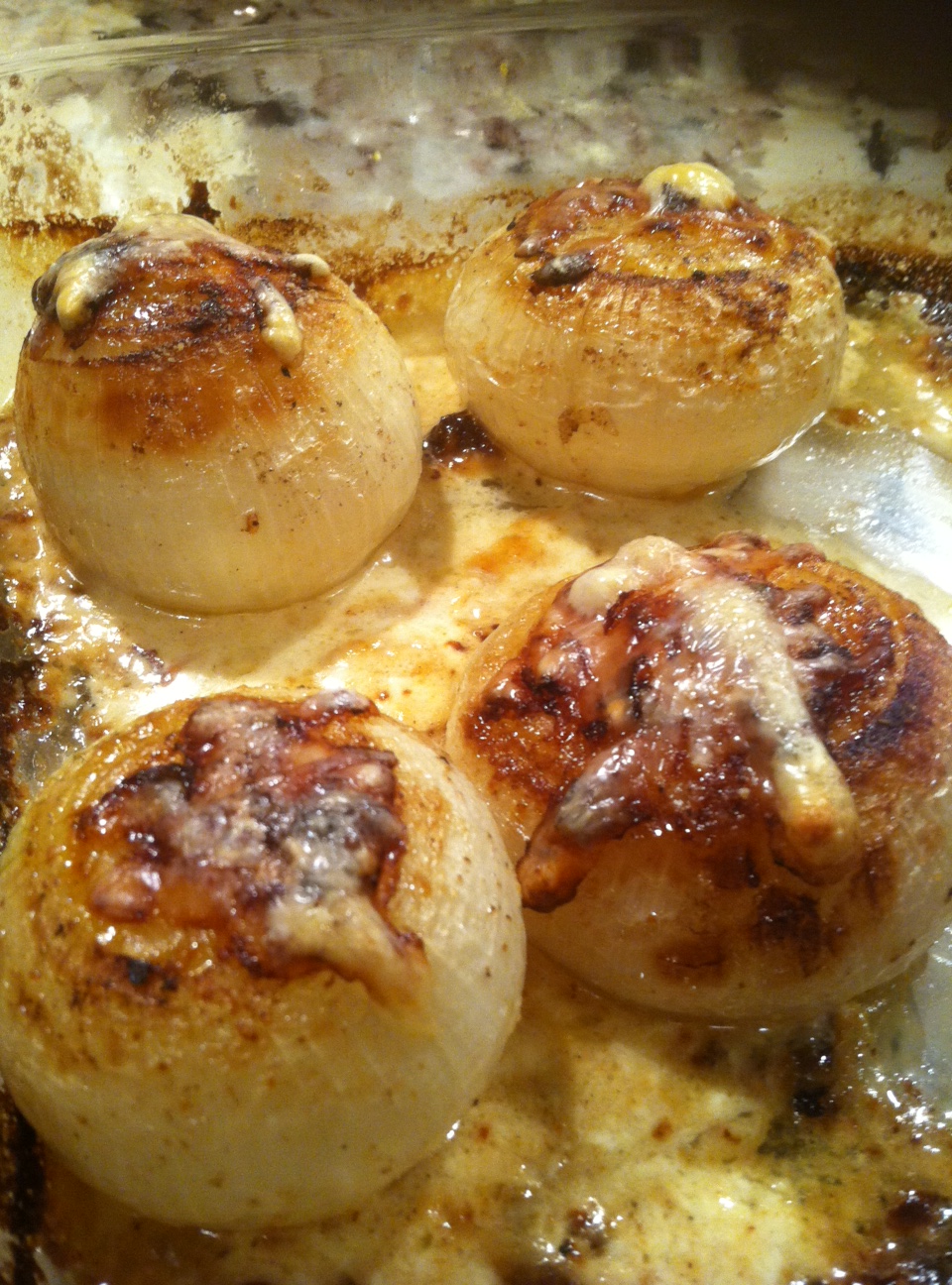 Remove onions and place in baking dish. Add cream and wine to baking dish and stir onions around making sure they are well coated. Organize your onions so each one is face up in the baking dish. Top with grated cheese and Swiss cheese. Bake in oven until the tops are browned and onion have turned a golden color. About 20 minutes or so depending on your oven.