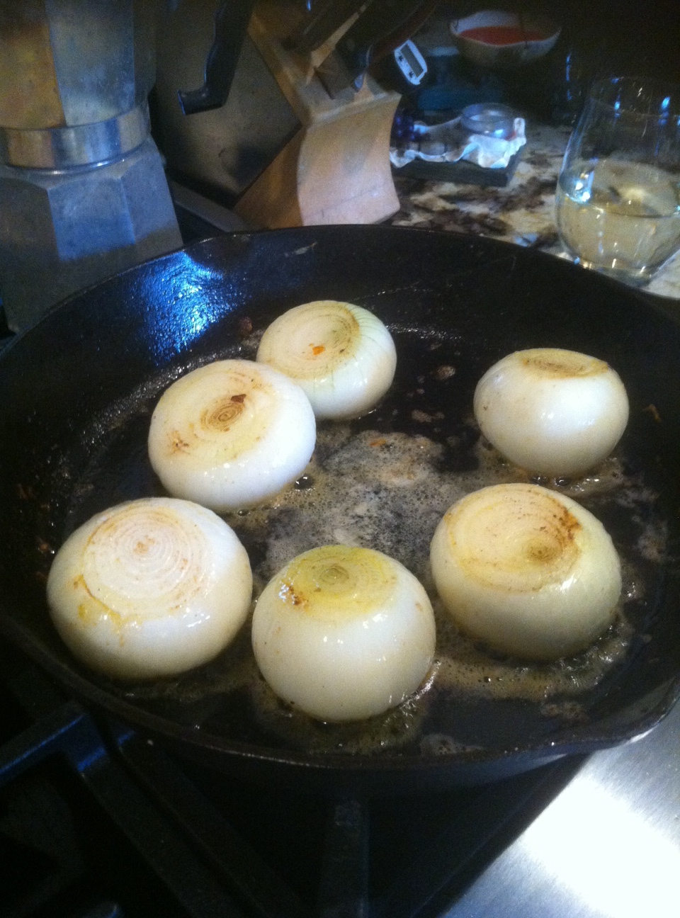 Peel onions removing all the tough skin. Cut off tops and bottoms so onion can sit flat without tipping over. Cut in half through the core so the onion rings stay in tact (I did not cut mine in half and had to adjust cooking time). Over medium/high heat sauté onions in butter. Move around so onion does not burn and turn over so both sides are able to cook. Cook until slightly limp and center of onion will begin to raise up, approximately 8 minutes.