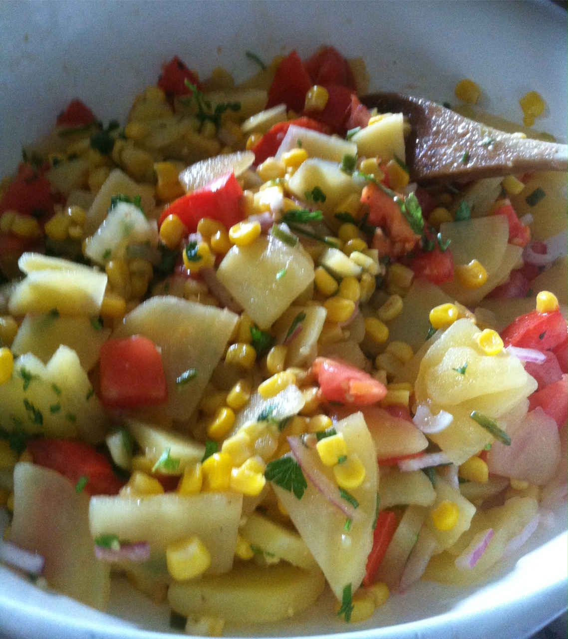 In large skillet fry potatoes in oil until tender (just browning) approx. 5 minutes. Add peppers and corn while stirring until corn is no longer crunchy. Approx. 4 minutes. Remove from heat and let stand.