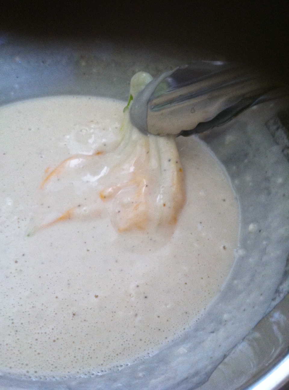 Dip each flower into batter and rest on side of bowl letting excess batter pour off. Drop each flower in to oil for approx. 3 to 4 minutes. Be sure not to over crowd in the pan. Turn each flower so they brown evenly. Remove from oil and place on paper towel lined platter or baking sheet. That’s it. I hope you try them with my dip.