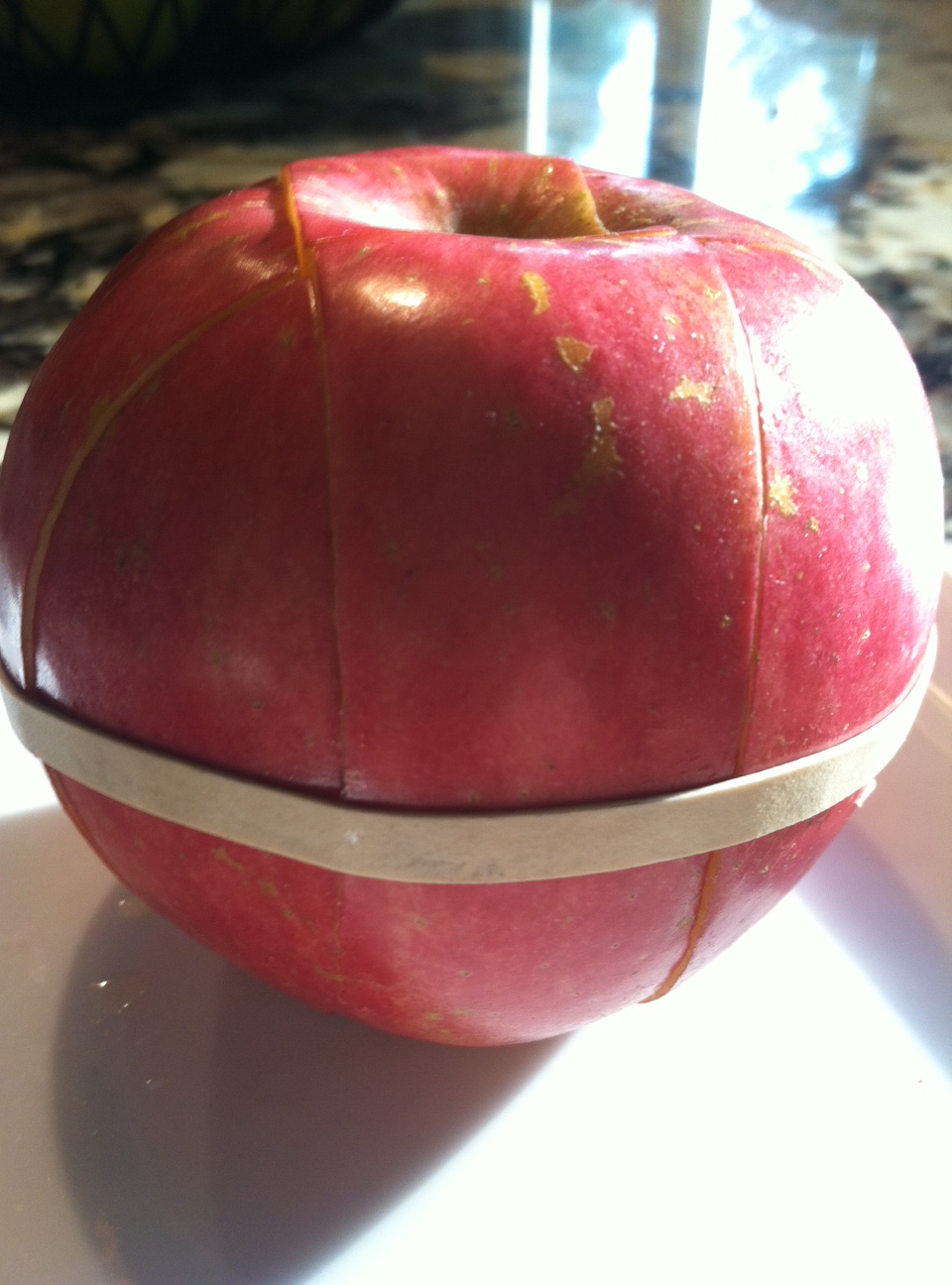 Gather pieces back up and place a clean rubber band around the widest part, place in a Ziploc and you’re done! Apples will not brown using this method. If using an orange or any other more juicy type fruits wrap with a damp paper towel before placing in baggie and you are good to go with no sticky fingers while you snack. —Just keep in mind some boys will turn the bands into flying objects :0 if you know what I mean……