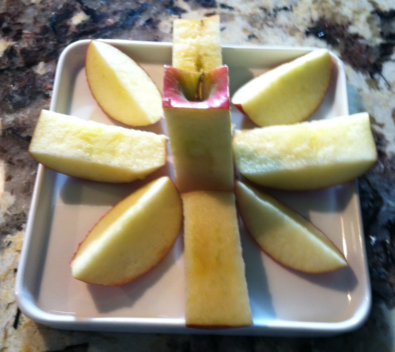 It is simple. Take an apple, orange, pear or any other round fruit and slice as I have shown below.