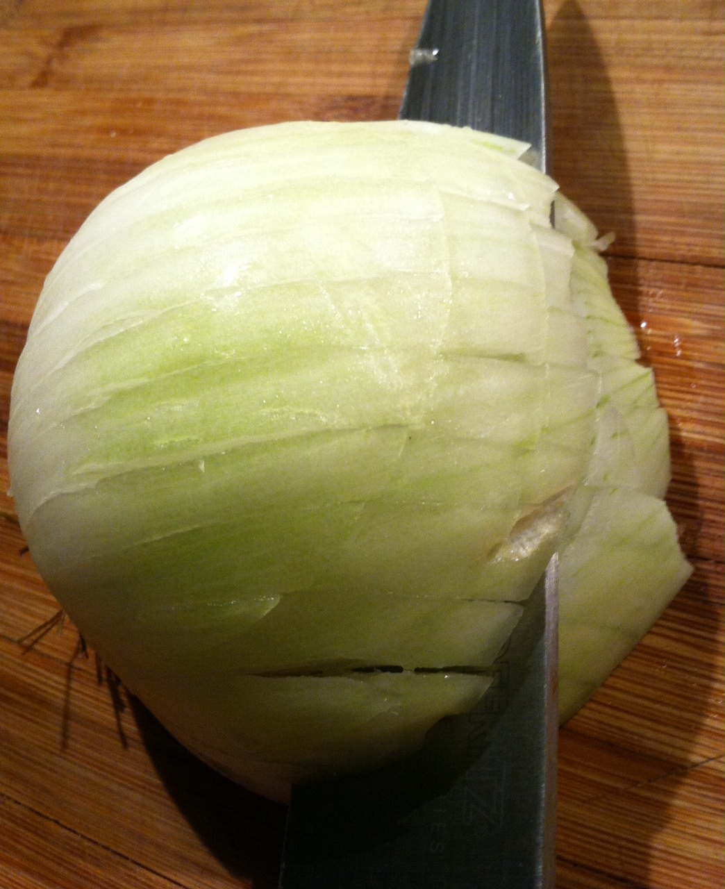 Now, make three or four slices sideways, again making sure not to cut all the way thru the onion so that the onion is still in one piece as shown below.