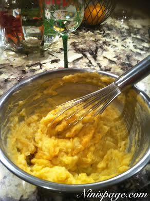 Boil potatoes in salted water until they are very tender. (Sweet potatoes may take longer to soften, so start those at least 5 minutes earlier) Drain water from pan and begin mashing potatoes until large pieces are broken down.