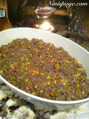 Continue cooking for about 15 minutes until all moisture is evaporated. Season with salt and pepper to taste and remove any fat. If you use lean meat there really shouldn’t be any fat to discard. To the meat and onion mixture add garlic and butter and continue to sauté for a minute. Add flour and continue stirring for about 5 minutes and then add the beef consommé or broth. This will thicken as it starts to simmer. Continue to simmer for about 10 minutes. Now add all of your frozen veggies until veggies are well blended with meat mixture.