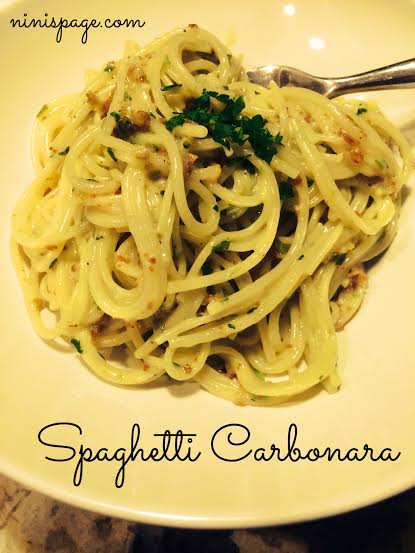I always ordered the same dish Spaghetti Pomodoro, which is basically spaghetti tossed with a fresh tomato sauce. Simple right? But I love it! It reminds me of home and making sauce from my moms canned garden tomatoes. Well, many moons ago while dining at my favorite Italian Restaurant, I was all ready to place my usual order….then, I saw it, as it passed by me and was placed right in front of the person at the next table over. Yes! There it was Spaghetti Carbonara. It looked like a creamy mound of spaghetti tossed with bits of bacon and parsley. I ordered it, I ate it, I fell in love with it! Now 20 something years later…. I always order it if it’s on the menu. But, unfortunately it seems harder and harder to find while dining out. So, I jumped on the internet and after a few scrambled egg disasters and tweaking a few different recipes I have perfected my own. It really is a simple dish. I am sure you have the following ingredients.