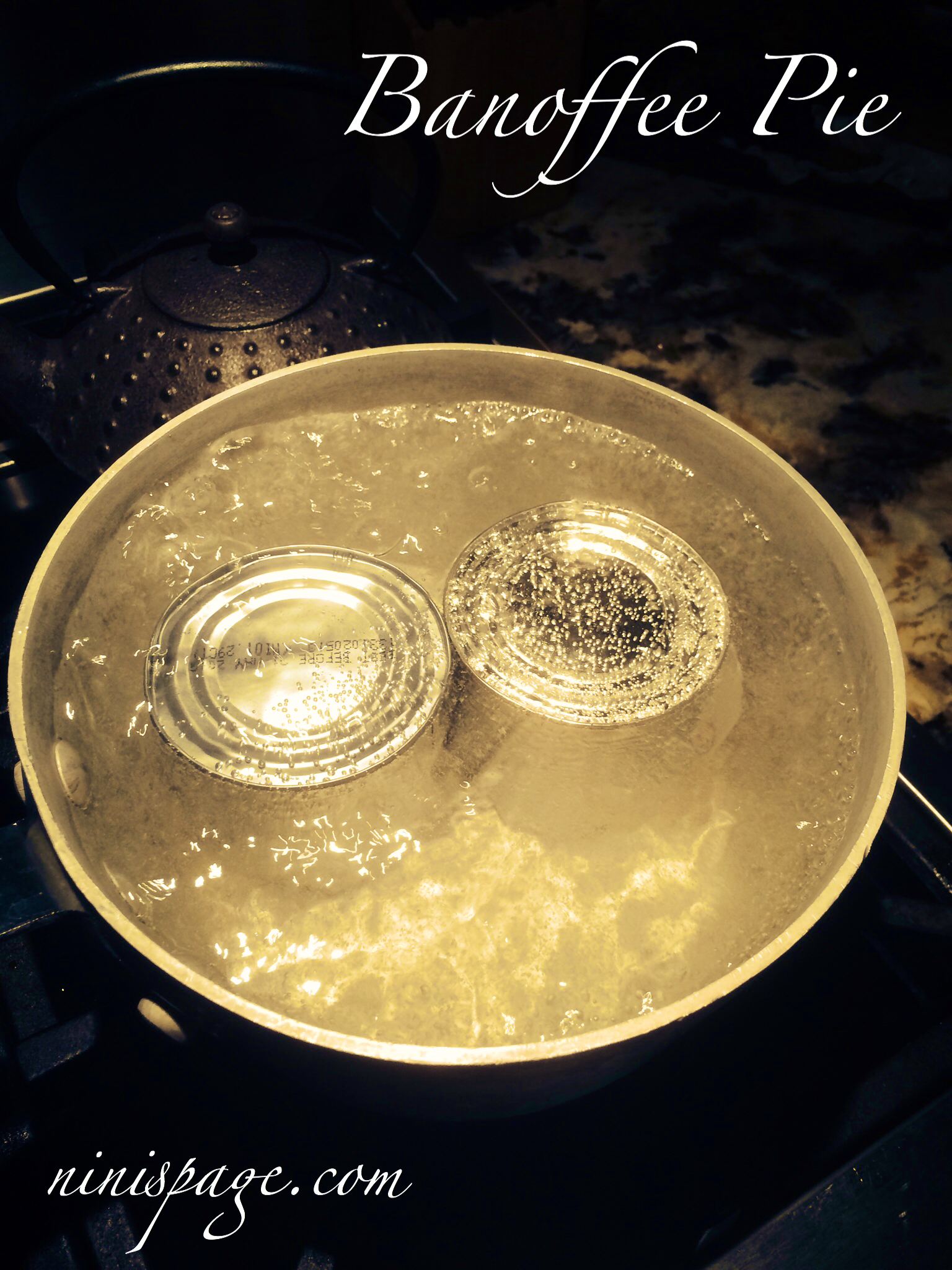 Now, lets get that caramel/toffee filling going the old fashioned way. This is the longest process (causing many to use that ready made quick fix I was telling you about). You will need to remove the labels from the cans of sweetened condensed milk and place them in a deep pan filled with water. It is very important that the water must cover the tops of the cans. (I always make a few cans so I have them on hand for other recipes). Now, bring to a boil and lower the heat to a low simmer.